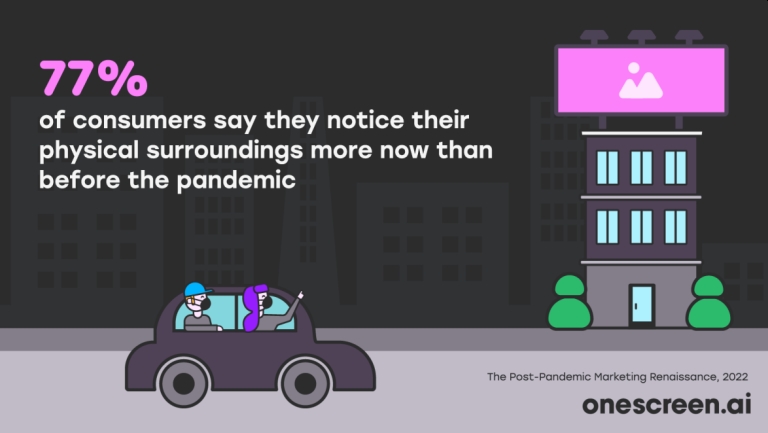 На щастя, це не стосується OOH-реклами. Навпаки — дослідження OneScreen.ai свідчить про те, що 77% споживачів звертають увагу на своє фізичне оточення більшою мірою, ніж до пандемії. Люди проводять менше часу перед екранами й більше — поза домівкою, а відтак й більше уваги звертають на OOH-рекламу.