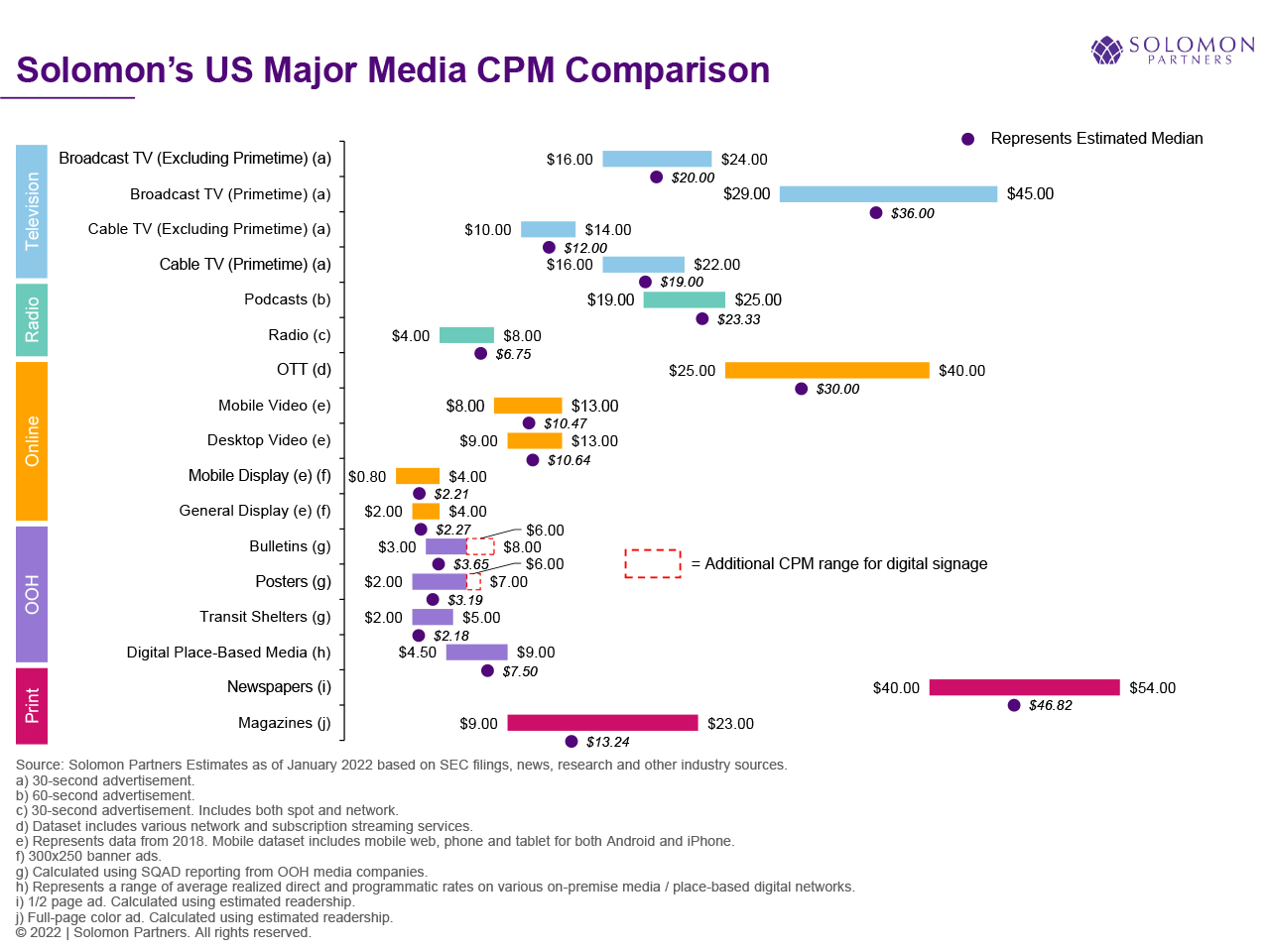 Згідно зі звітом «Порівняння CPM в основних медіа США», вартість тисячі контактів в OOH-медіа складає 2—3 долари. Менше коштує хіба що мобільна медійна реклама. Загалом, якщо порівнювати CPM в OOH-рекламі зі значеннями цього показника в інших цифрових та «традиційних» медіа, різниця велика.
