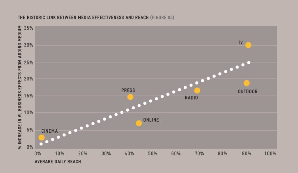 Розмір охоплення рекламних кампаній залишається ключовим фактором збільшення популярності та ринкової частки брендів. У Великобританії OOH-медіа охоплюють понад 90% населення. Згідно з дослідженням IPA “Marketing Effectiveness in the Digital Era”, бувши включеним в медіамікс, компонент OOH збільшує значення групи показників «business effects» (прибуток, виторг, ринкова частка, лояльність, чутливість до ціни та ін.) на 20%. За великим рахунком, OOH-реклама дозволяє створювати масову обізнаність при відносно низькій ціні за тисячу контактів. Дієвий і надійний засіб комунікації, OOH-реклама підштовхує споживачів ближче до краю маркетингової воронки, де інтернет-медіа відіграють дедалі важливішу роль.