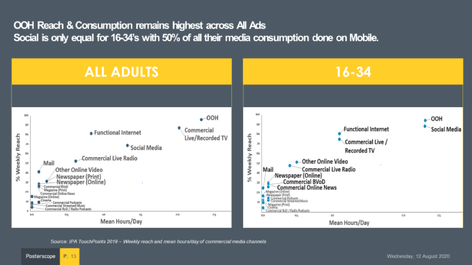 Зі звіту IPA “TouchPoints” випливає, що OOH-реклама й соціальні мережі — два основних канали для охоплення особливо цінної аудиторії віком від 16 до 34 років. Обидва канали характеризуються локальністю (place-based); в соціальні мережі часто заходять з мобільних пристроїв. При цьому OOH-реклама охоплює всі категорії населення.