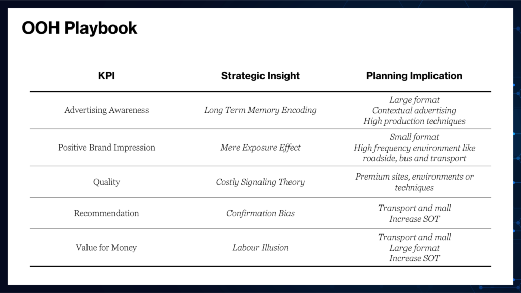 Робота демонструє, що OOH-реклама особливо добре підходить для вирішення таких завдань, як збільшення рівня обізнаності про рекламу; створення позитивного враження від бренду; поліпшення сприйняття якості; підвищення ймовірності того, що бренд рекомендуватимуть; створення сприятливого враження про співвідношення ціни і якості.