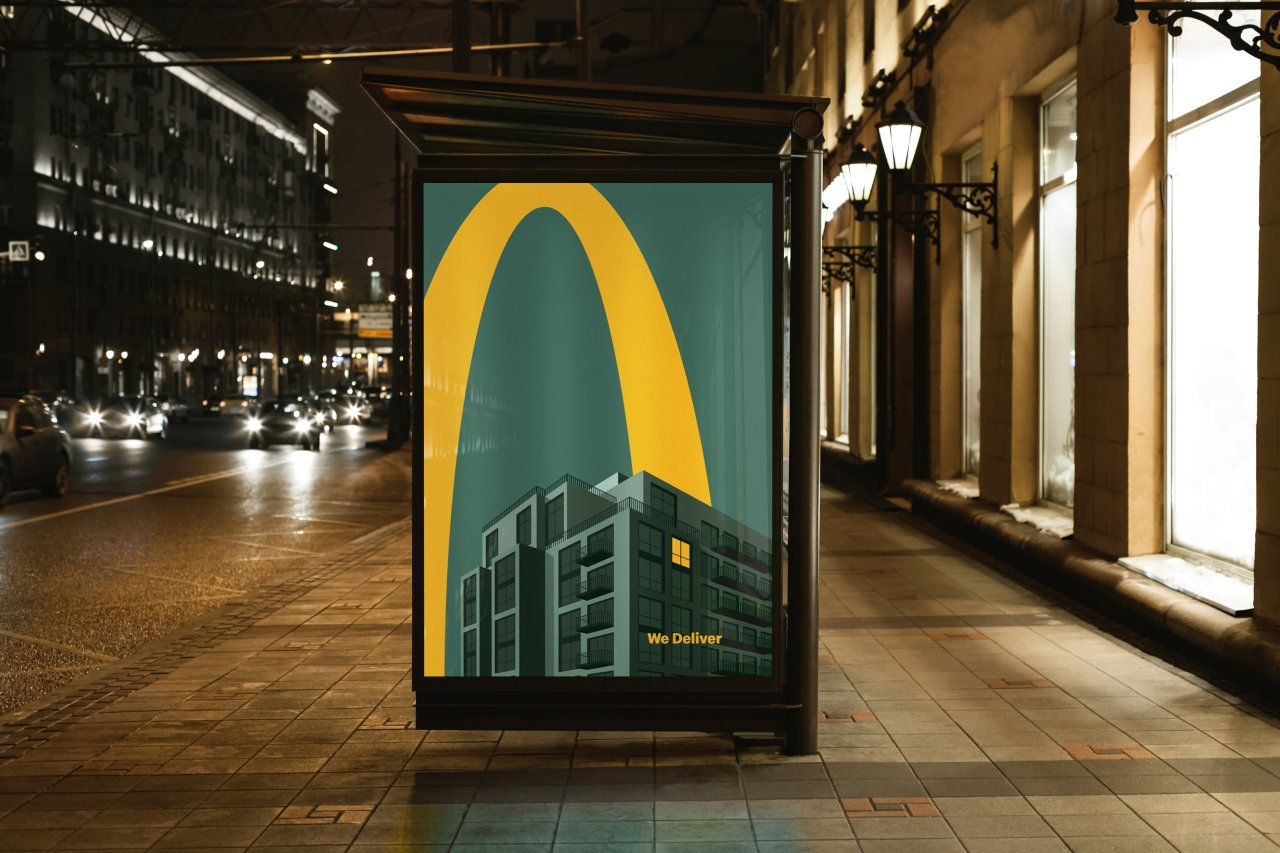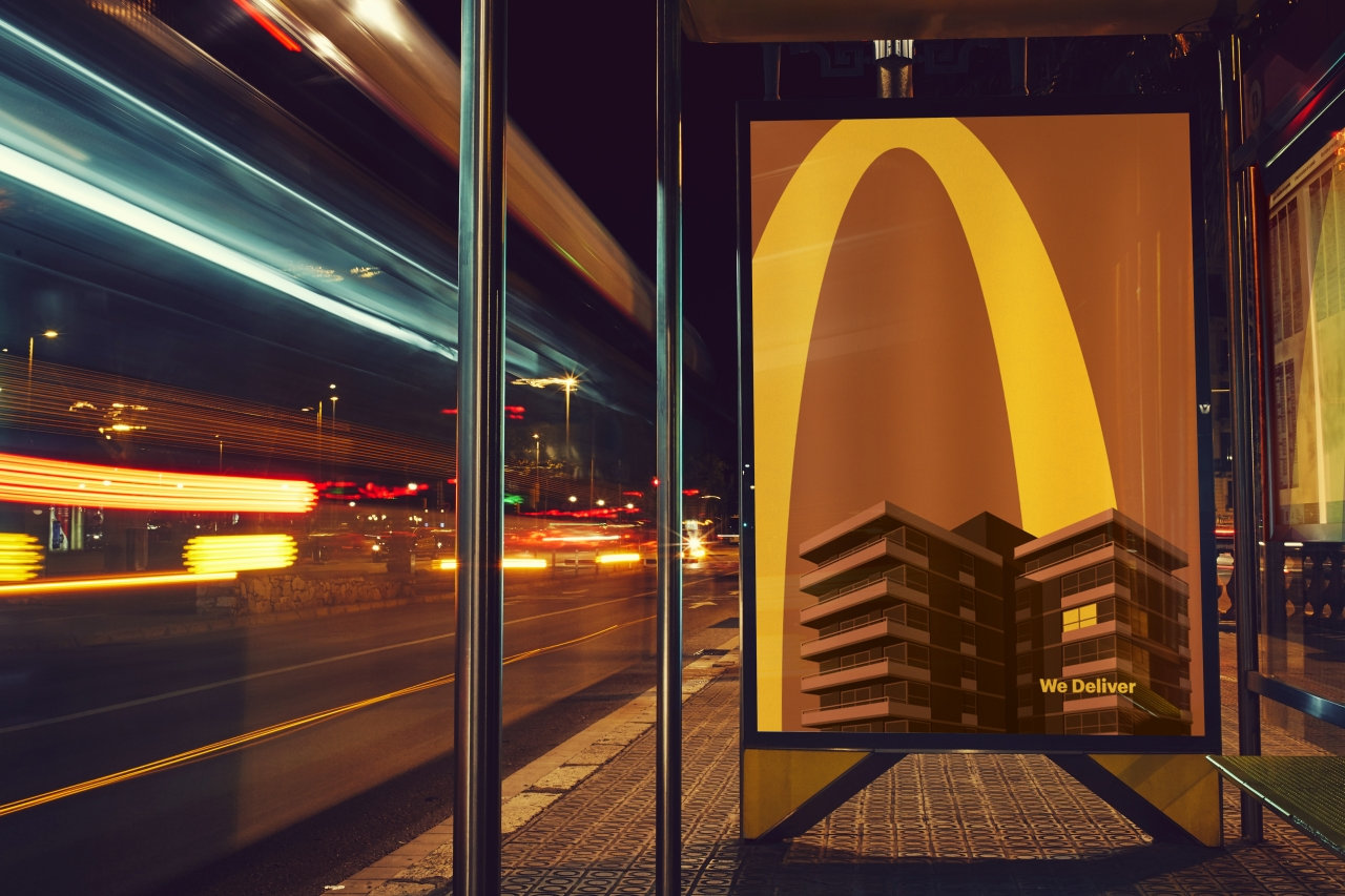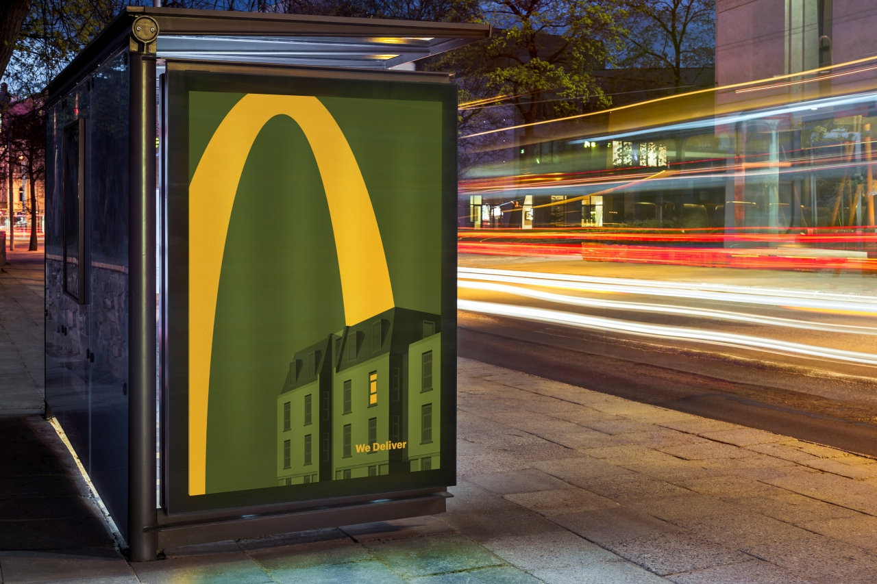 У новій out of home кампанії фірмові арки нагадують покупцям про те, що нехай навіть вони й не можуть увійти всередину ресторану, але можуть замовити доставлення.