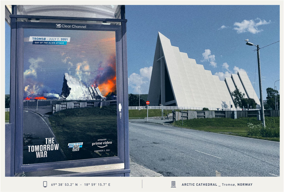 В країнах Скандинавії до виходу в прокат фільму «Війна завтрашнього дня» (The Tomorrow War від Amazon Prime) незалежна креативна агенція Small створила «Білборди завтрашнього дня», які «руйнують» архітектурні пам’ятки.