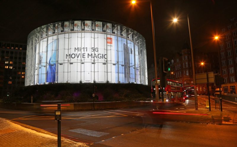 Xiaomi розмістила рекламу смартфона Mi 11 на фасаді цієї будівлі, і це виглядає дійсно разюче. Крім того, великі рекламні інсталяції смартфона встановлені в Лондоні та Бангкоку.