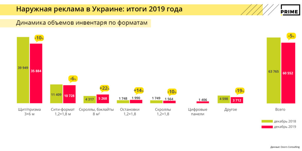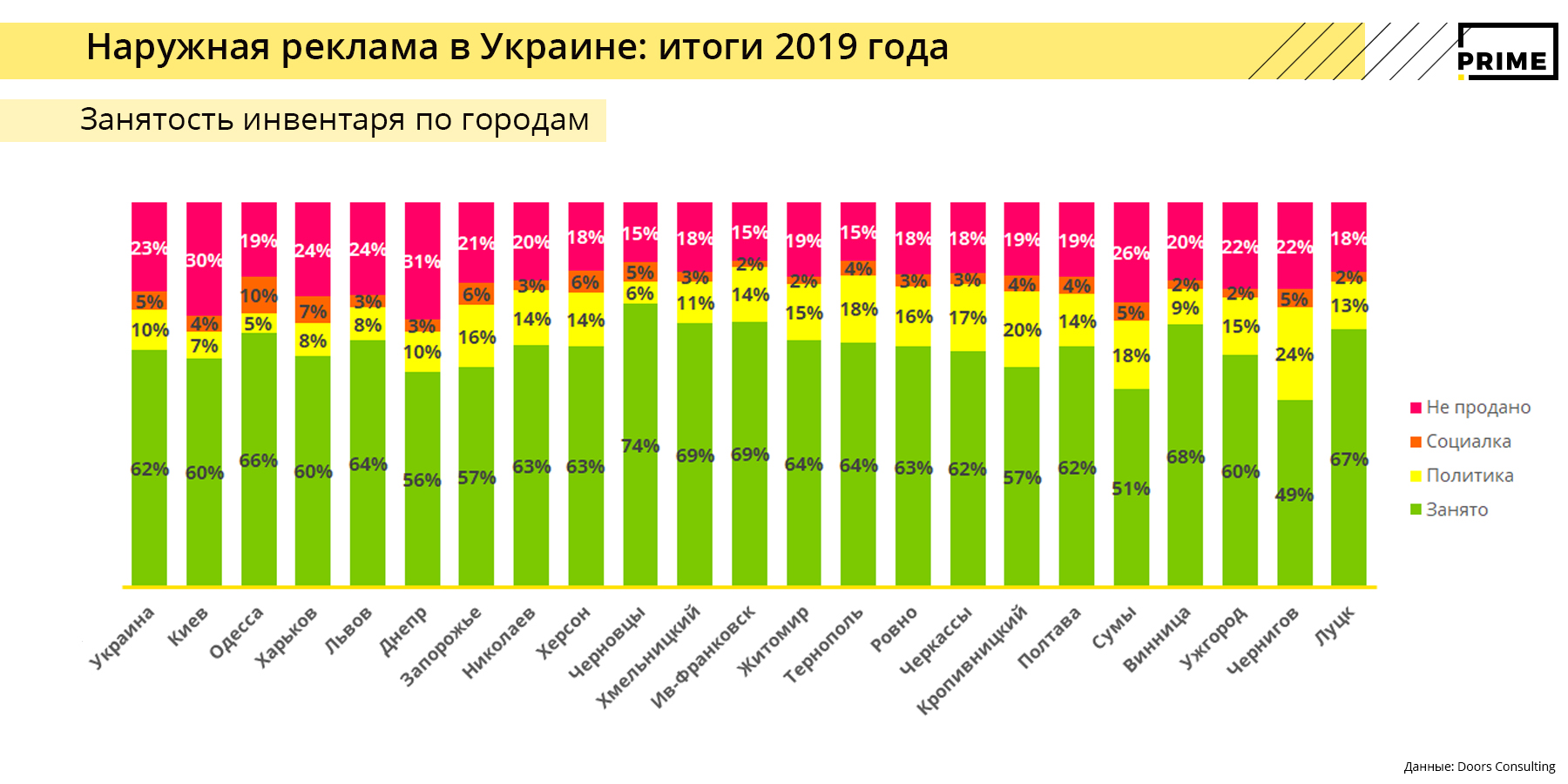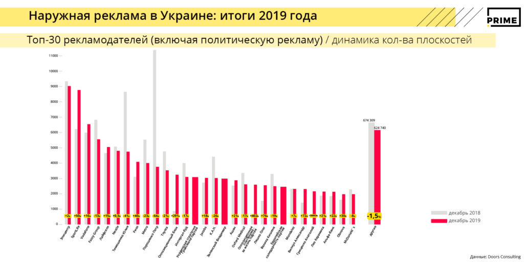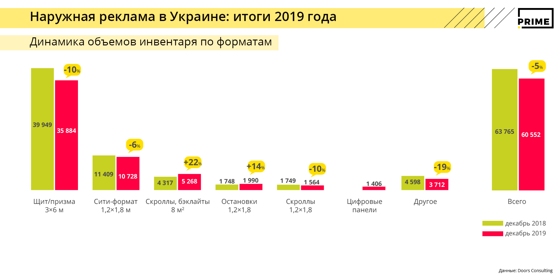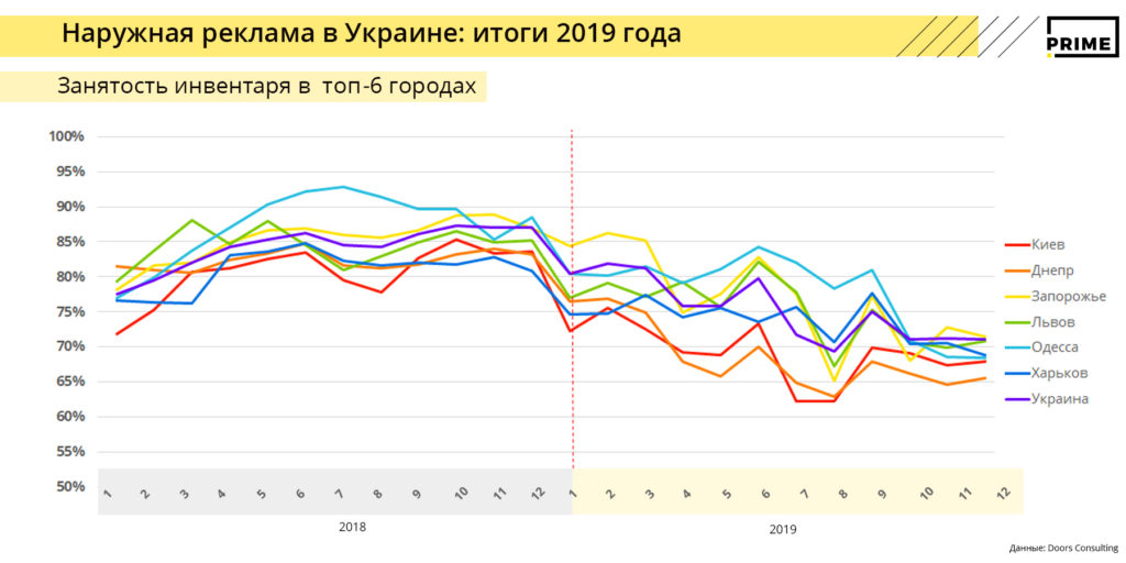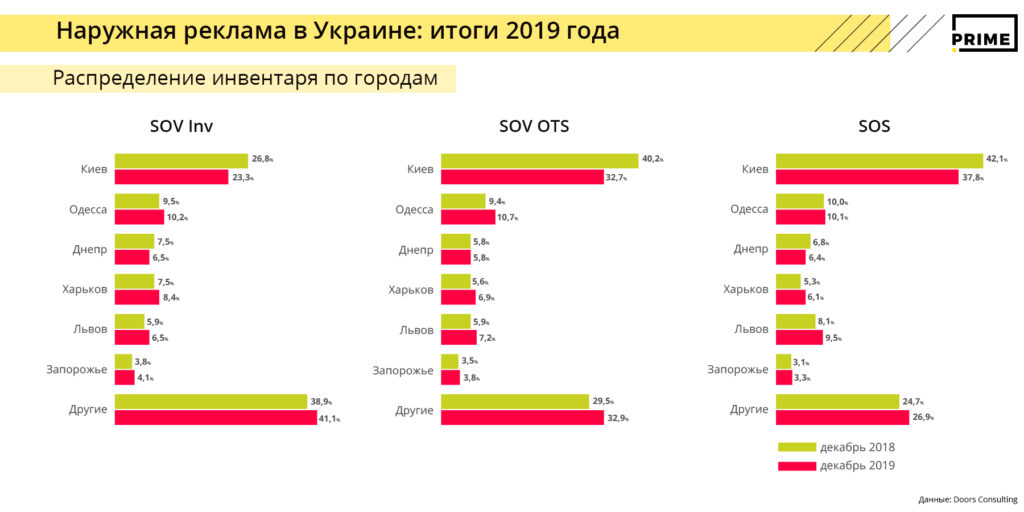 В значительной мере этому способствовало сокращение инвентаря в Днепре, Киеве и Харькове. За указанный период количество рекламных плоскостей в этих городах уменьшилось на 28%, 8% и 7% соответственно.