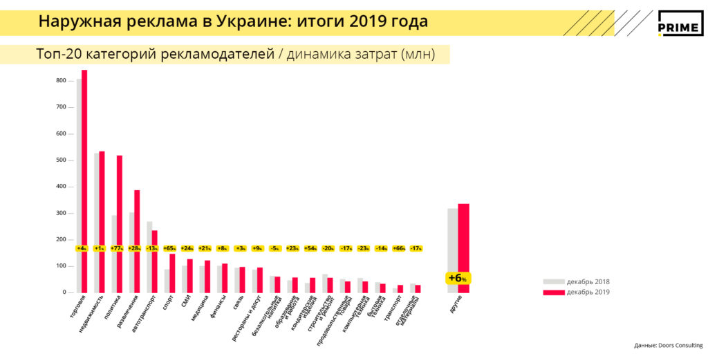 За четыре квартала 2019 г. объем рынка наружной рекламы увеличился на 13% по сравнению с аналогичным периодом прошлого года. Со второго полугодия, по завершению двух политических кампаний, начали восстанавливаться доли категорий традиционных рекламодателей.
