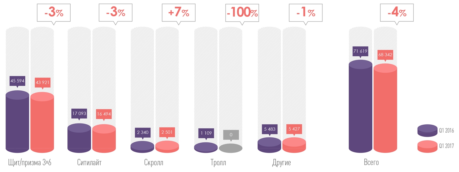 В первом квартале 2017 года количество инвентаря наружной рекламы сократилось на 5% по сравнению с первым кварталом 2016 года. Это произошло в основном за счет уменьшения числа щитов и призм 3×6 на 4%, сити-формата на 4%, а также полного демонтажа носителей формата тролл 1×5. При этом увеличилось количество скроллов и бэклайтов площадью около 8 кв. м — на 7% по сравнению с аналогичным периодом прошлого года.
