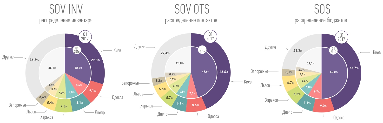 В результате демонтажей, связанных с изменением Концепции развития наружной рекламы в Киеве, количество столичного инвентаря в первом квартале 2017 года сократилось на 13%. Это основная причина перераспределения долей инвентаря по городам (SOV INV).