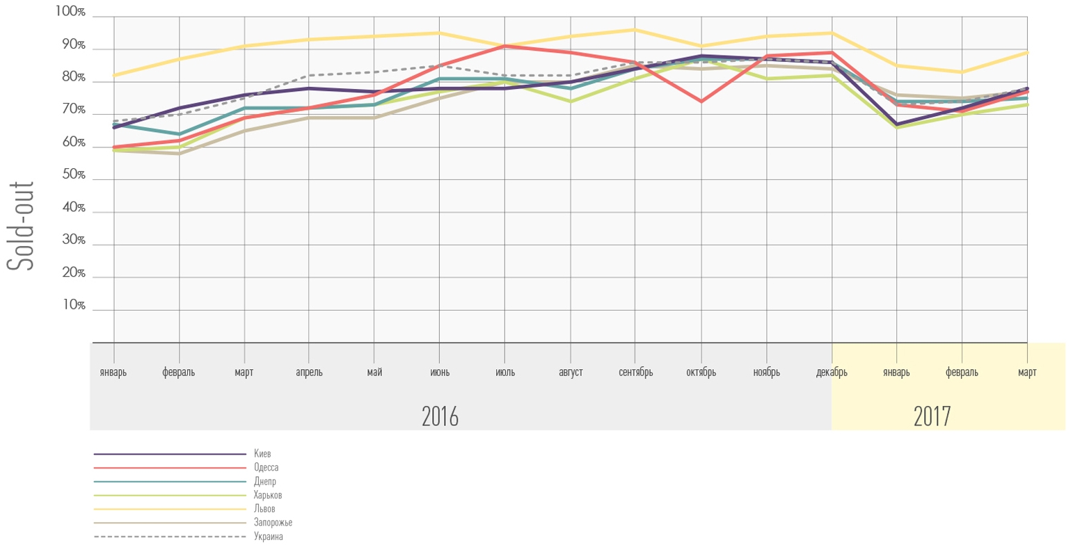 Во Львове даже в январе sold-out превышает 83%. По остальным ТОП-6 городам уровень распроданности в первом квартале 2017 года стал более однородным, особенно если сравнивать с первым кварталом прошлого года, что отчетливо видно на графике.