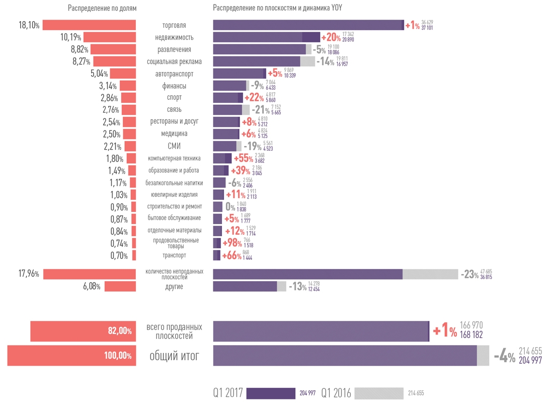 «Торговля» традиционно удерживает 1-е место, причем в первом квартале 2017 года доля категории выросла до 18% от всего объема размещения в наружной рекламе Украины.