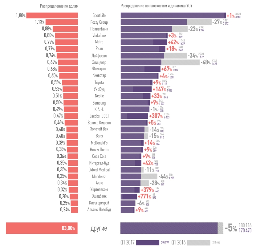 Ряд крупных рекламодателей заметно увеличил активность. В их числе магазины Metro (+42%) и «Фокстрот» (+67%), застройщики «Риэл» (+18%), «Укрбуд» (в 2,5 раза), «Интергал-Буд» (+43%). В первом квартале 2017 года выросла активность Nestle — на 33%, Jacobs (JDE) более чем в 3 раза, Coca-Cola — на 9%.