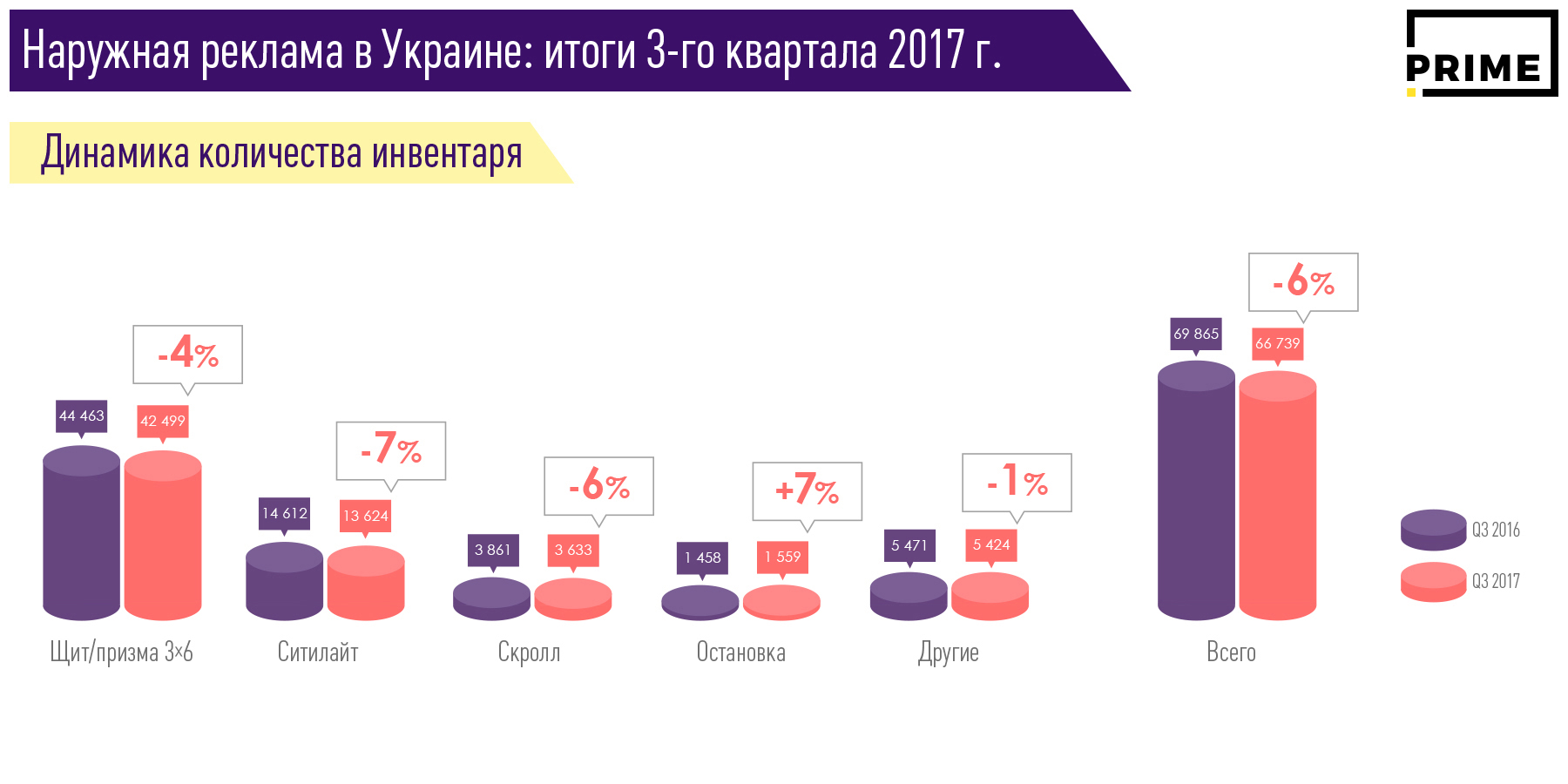 За девять месяцев 2017 года объем всего инвентаря наружной рекламы в Украине уменьшился по сравнению с аналогичным периодом прошлого года на 4,5%. Если сравнивать количество рекламных плоскостей по Украине в сентябре 2017 г. со значением аналогичного показателя в январе 2016 г., сокращение составило 6,6%. Больше всего инвентарь сократился в Киеве и Харькове — на 12 и 8 процентов соответственно по сравнению с объемом инвентаря в сентябре прошлого года. Начиная с июля 2017 г. процесс демонтажа рекламных конструкций замедлился.