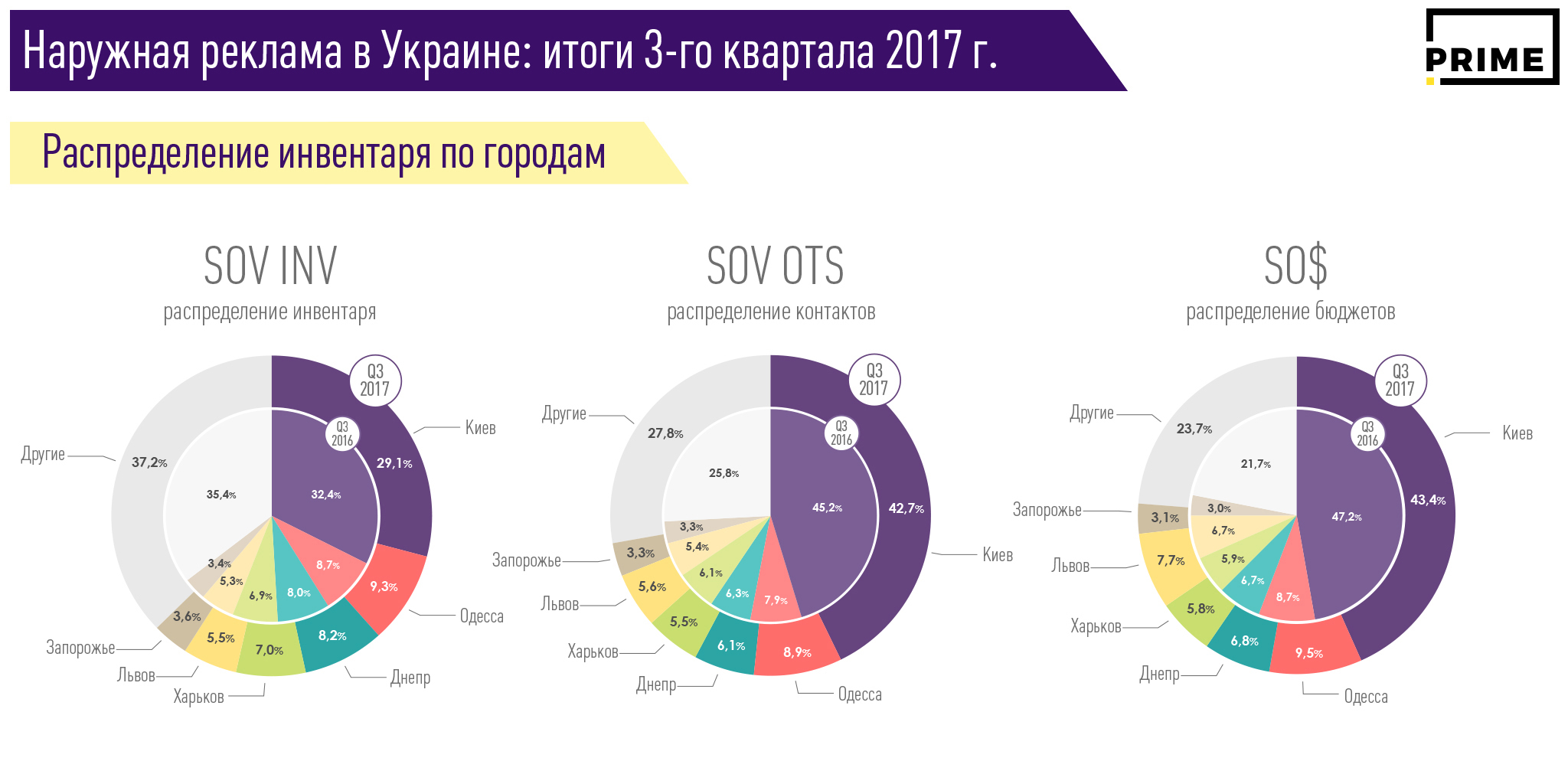 В результате демонтажа, связанного с изменением Концепции развития наружной рекламы в Киеве, за три квартала 2017 г. количество инвентаря в столице сократилось на 15%. Это стало основной причиной перераспределения долей инвентаря по городам (SOV inv.). Говоря о ТОП-6 городах, физически увеличилось число плоскостей только в Одессе — на 2%, в остальных городах — незначительно сократилось. Доля бюджетов рекламодателей за три квартала 2017 г. среди ТОП-6 городов больше всего увеличилась во Львове. Произошло это в связи с высоким спросом и наибольшей инфляцией.