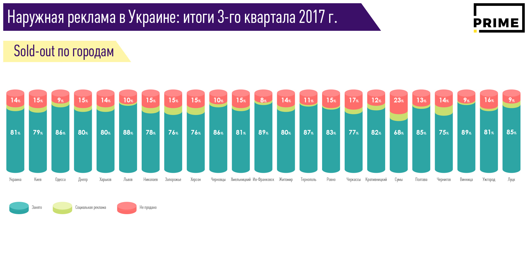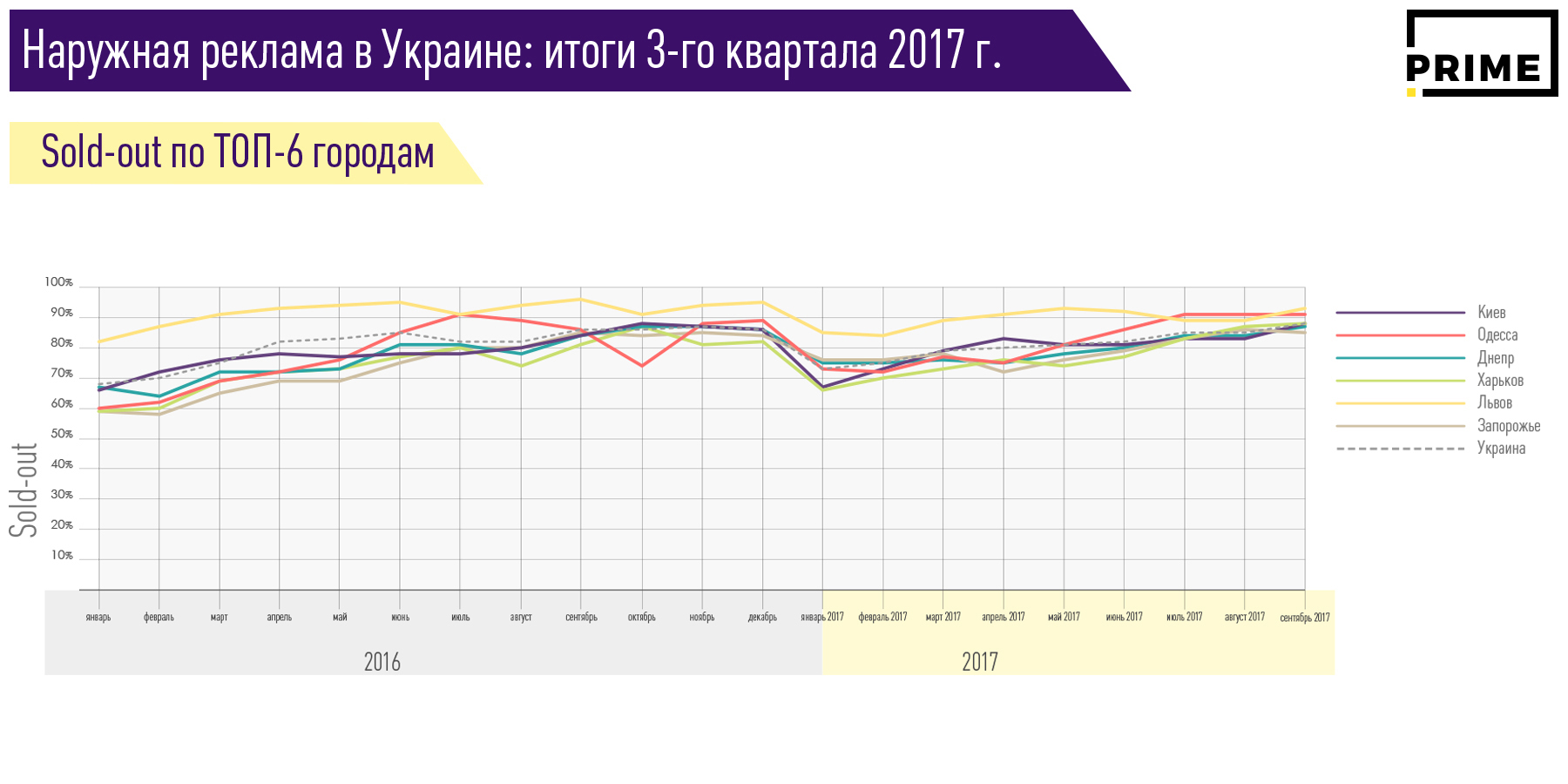 Занятость рекламных плоскостей по итогам трех кварталов 2017 г. на 6% выше, чем в аналогичном периоде прошлого года. В этом году сезонное снижение значения показателя в июле—августе не наблюдалось. Начиная со второго квартала 2017 г. заполняемость плоскостей во всех ТОП-6 городам стала однородно высокой. По-прежнему стабильно высокая заполняемость инвентаря во Львове. С мая по сентябрь наблюдается сезонный рост уровня sold out в Одессе.