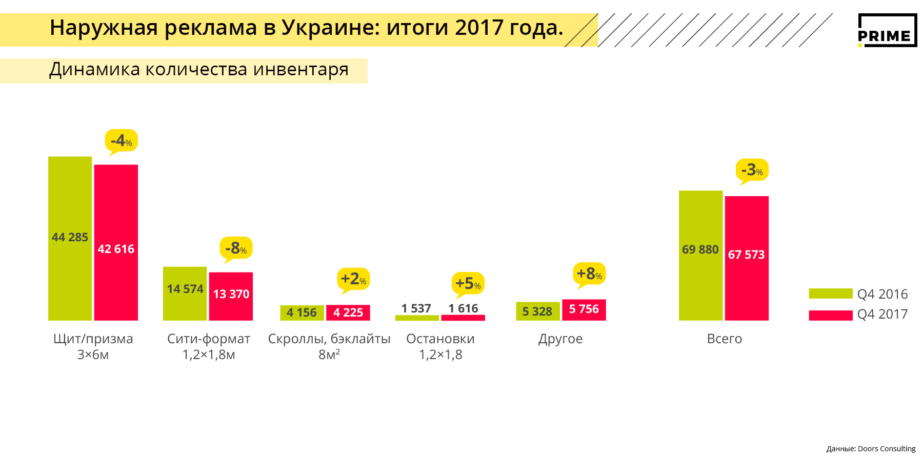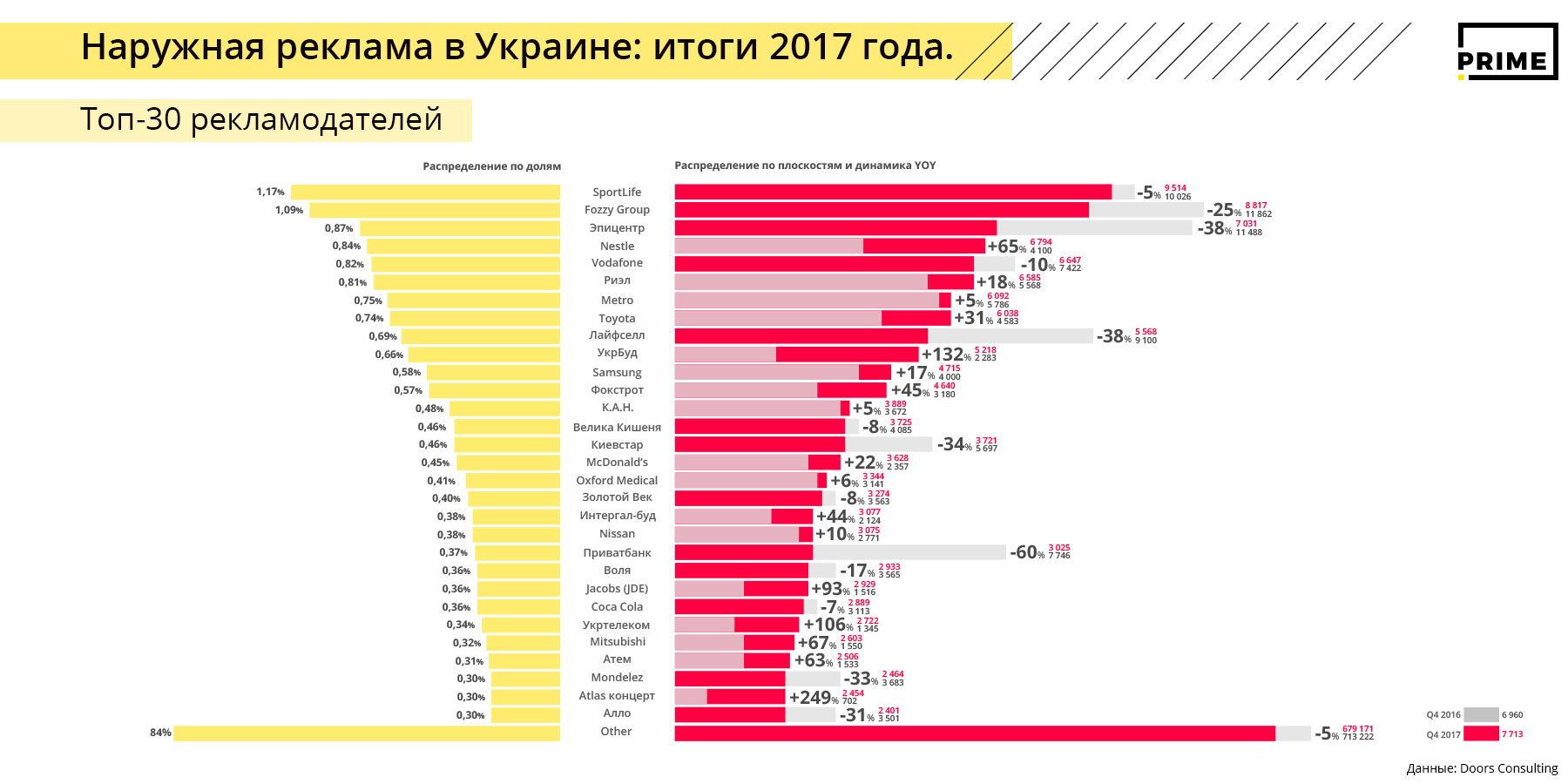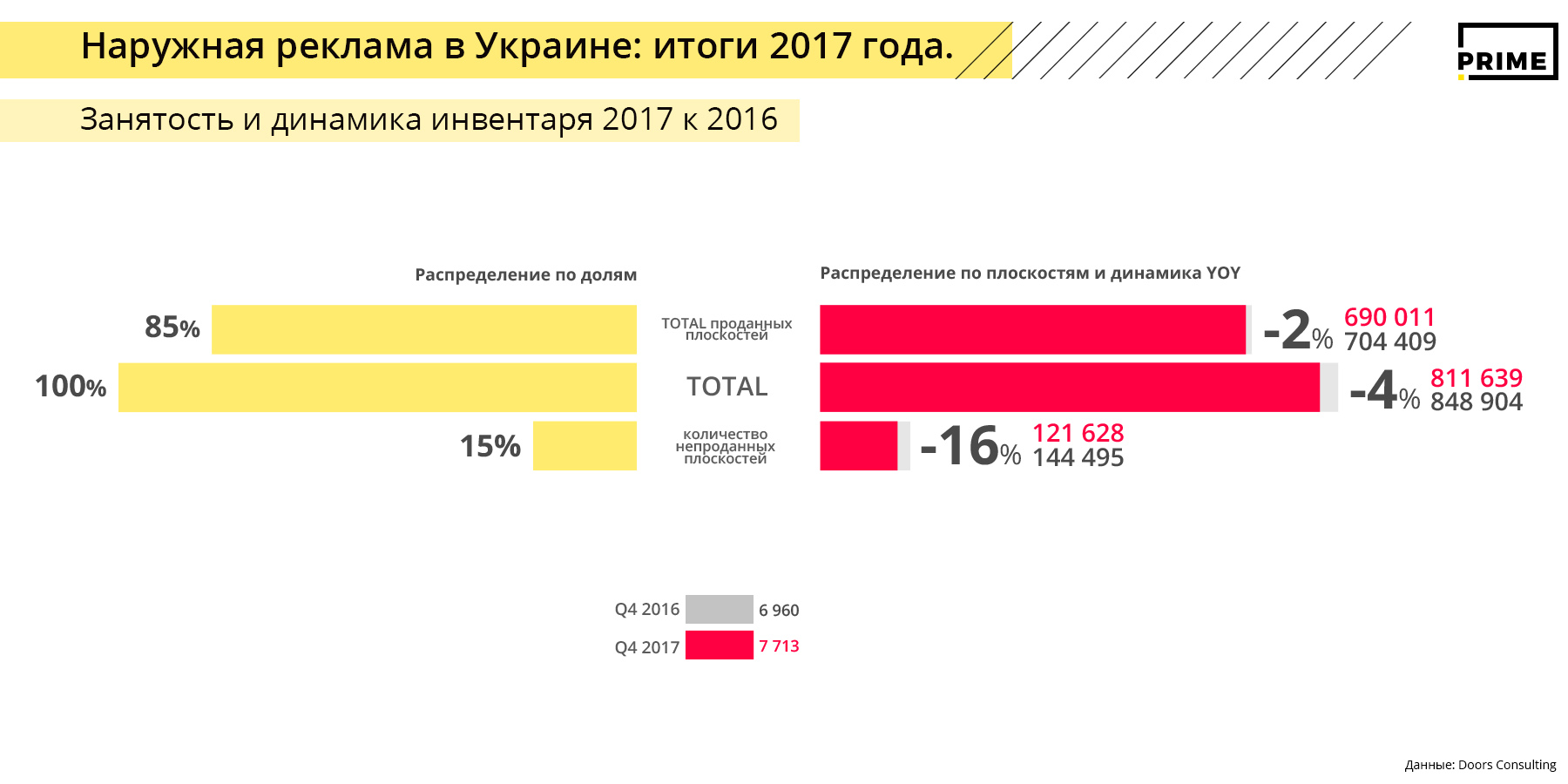Оператор наружной рекламы PRIME Group визуализировал основные параметры рынка наружной рекламы по итогам 4-го квартала 2017 г. В основу материала легли данные исследователя аудитории наружной рекламы Doors Consulting за соответствующий период.