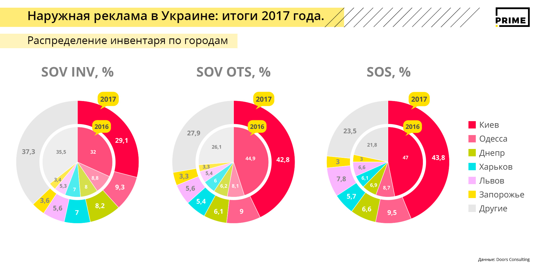 В связи с реализацией городских концепций развития наружной рекламы с начала 2017 г. продолжился демонтаж в Киеве (-5% по сравнению с декабрем 2016 г. по всем форматам), с весны — в Харькове (-6%) и с осени — в Днепре (-1%). Это и есть основная причина перераспределения долей инвентаря по городам (SOV inv.). Вместе с тем, в некоторых из топ-6 городов количество рекламного инвентаря увеличилось. Так, во Львове его стало на 7% больше (всех форматов) по сравнению с декабрем 2016 г. В Одессе объем инвентаря вырос на 2% за счет новых скроллов и замены щитов на призмы. В 2017 г. доля бюджетов рекламодателей в топ-6 городах больше всего увеличилась во Львове и Одессе. Причиной послужило увеличение количества инвентаря, высокий спрос на него и наивысший уровень инфляция среди топ-6 городов.