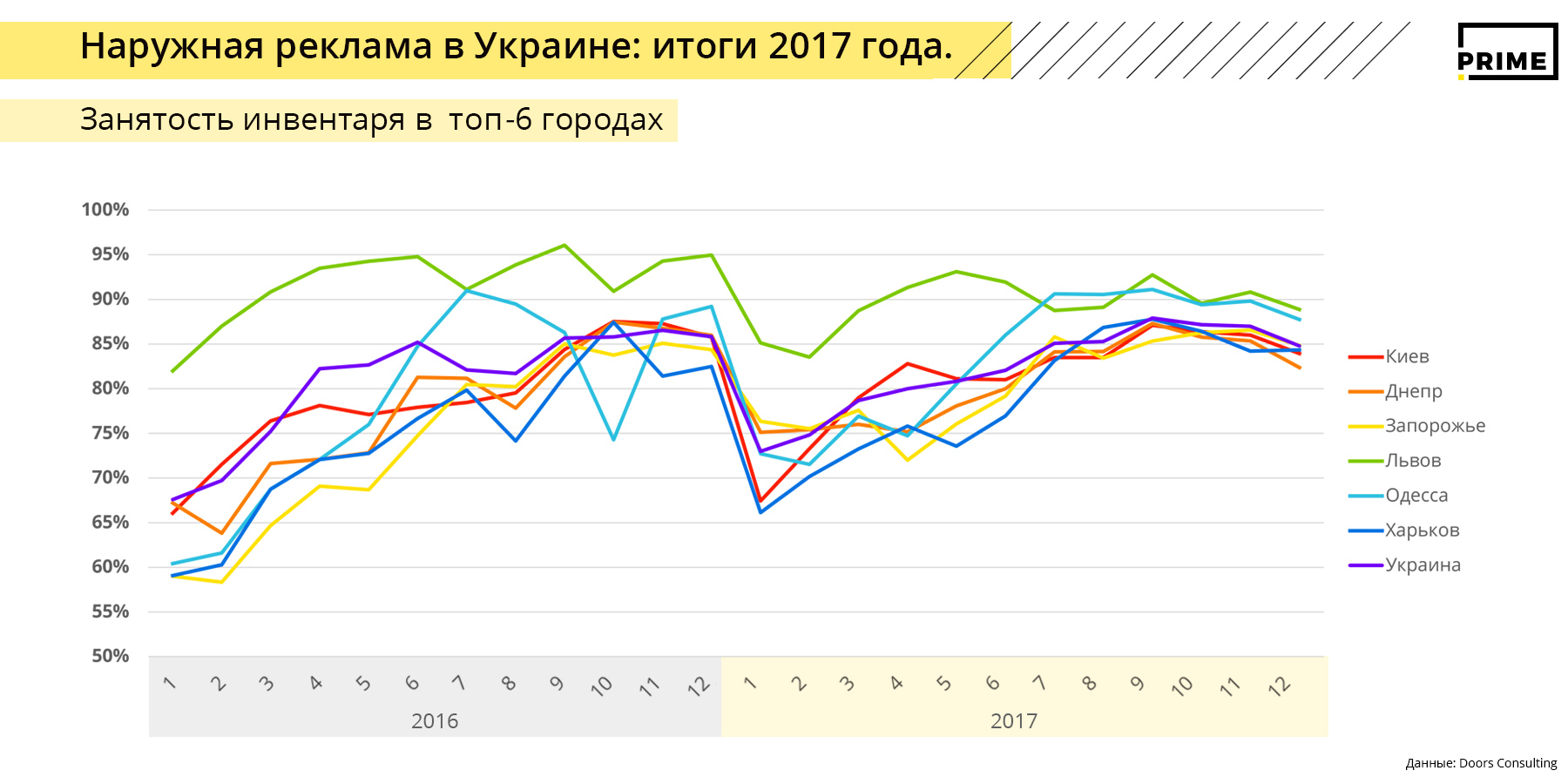 Занятость рекламных плоскостей в 2017 г. выше на 2%, чем в 2016-м. В 2017 г. не было сезонного снижения занятости в июле-августе. Начиная со второго квартала 2017 г. заполняемость плоскостей во всех топ-6 городах стала однородно высокой. Стабильно высоким сохраняется уровень занятости инвентаря во Львове.