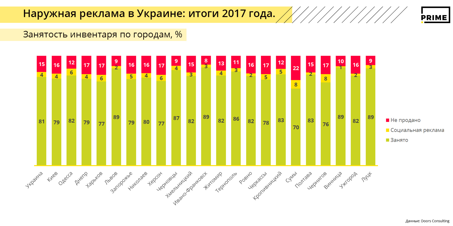 В 2017 г. средний уровень занятости инвентаря по Украине — 81%. Кроме запада страны (Львов, Черновцы, Ивано-Франковск, Тернополь, Луцк, Ровно), где высокий уровень распроданности инвентаря наблюдается еще с 2016 г., в 2017 г. стабильно повышенный спрос был в Виннице, Кропивницком и Полтаве.