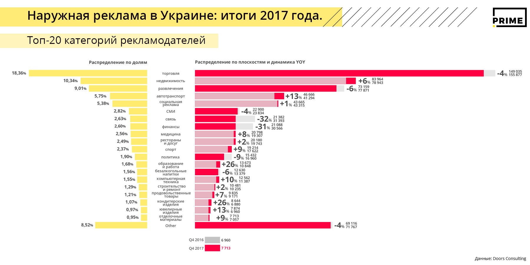 Категория «Торговля» традиционно удерживает 1-е место, при этом доля в 2017 г. осталась той же, что и в 2016-м — 18,36%, хотя количество плоскостей, занятых рекламой этой категории, и уменьшилось на 4%.