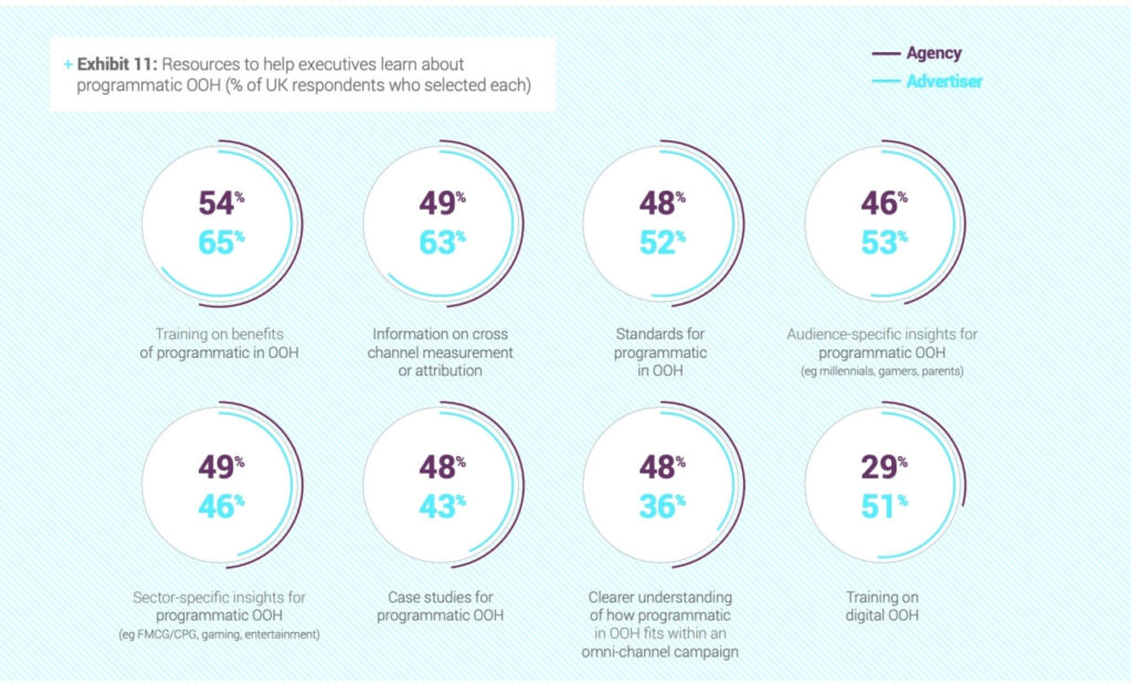 На вопрос о том, как следует измерять программатик OOH, 69% респондентов из Великобритании ответили, что следует использовать показатели эффективности (performance-based metrics), а 57% респондентов сообщили, что нуждаются в дополнительной информации о кроссмедийных измерениях и атрибуции.