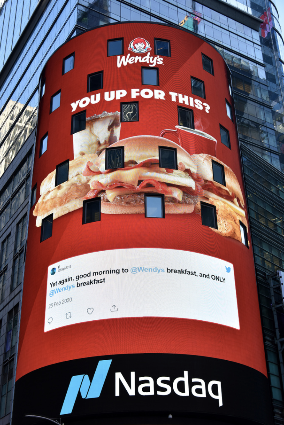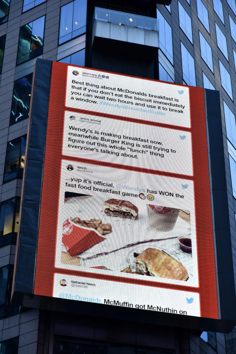 McDonald’s отметил «Национальный день яйца МакМаффин», озираясь на конкурента Wendy’s, который также продвигал завтраки в сети ресторанов фаст-фуда. В то время как McDonald’s раздавал бесплатные МакМаффин сэндвичи, на билбордах Таймс-сквера размещались твиты, в которых пользователи восхваляли новый завтрак в Wendy’s и критиковали конкурентов.