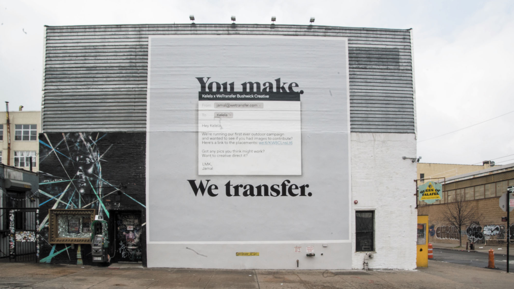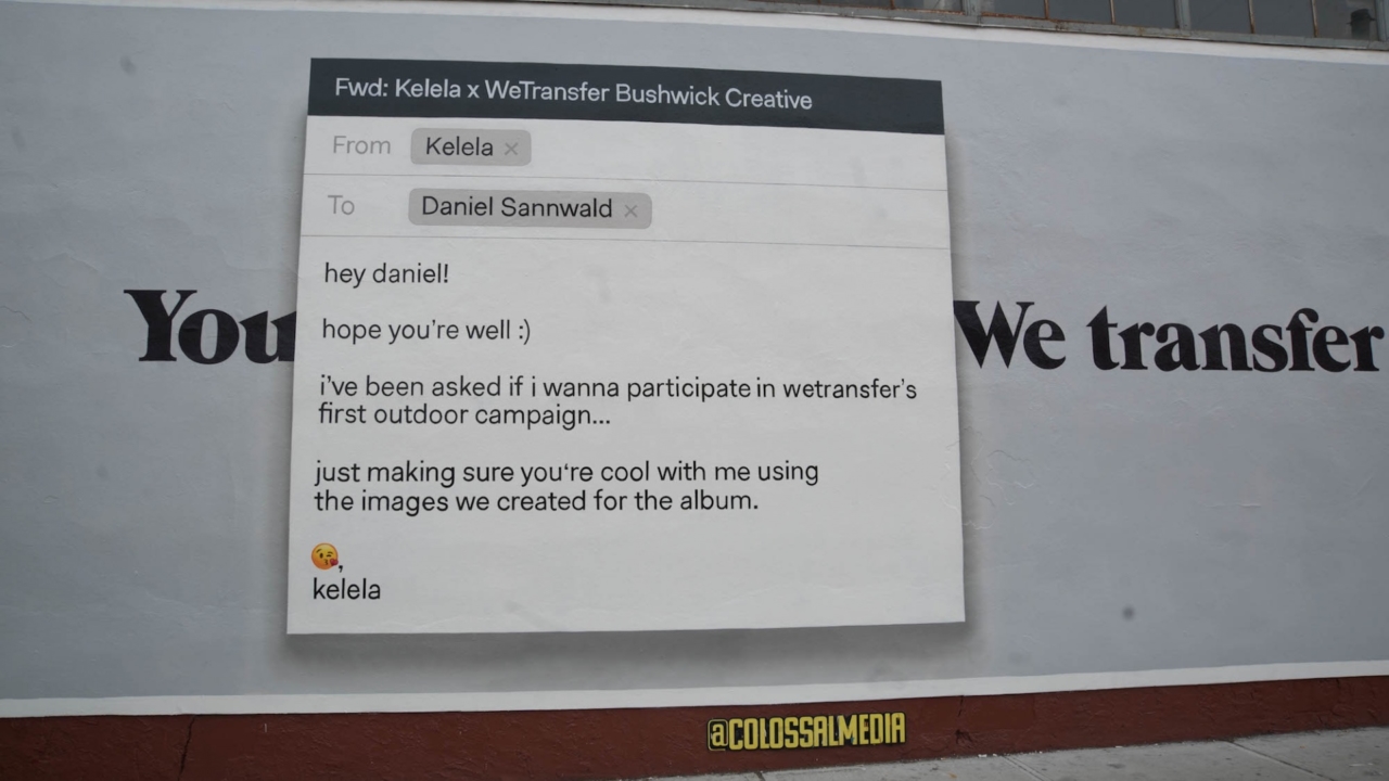 Сама история довольно прозаична, но в этой будничности и заключалось ее очарование. Первым эпизодом стал мурал со скриншотом письма WeTransfer к певице Kelela, в котором файлообменный сервис приглашает ее участвовать в этой же рекламной кампании.