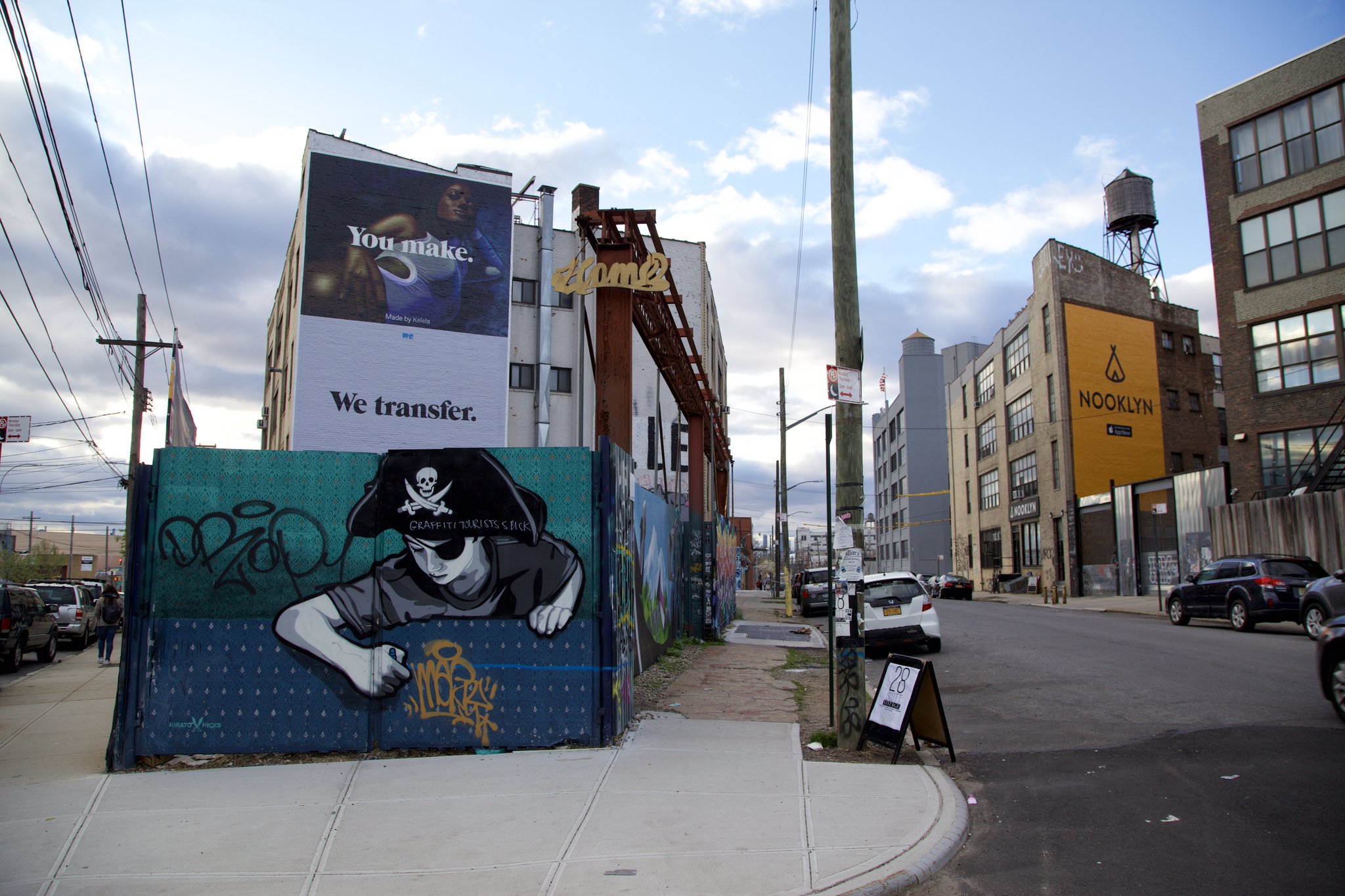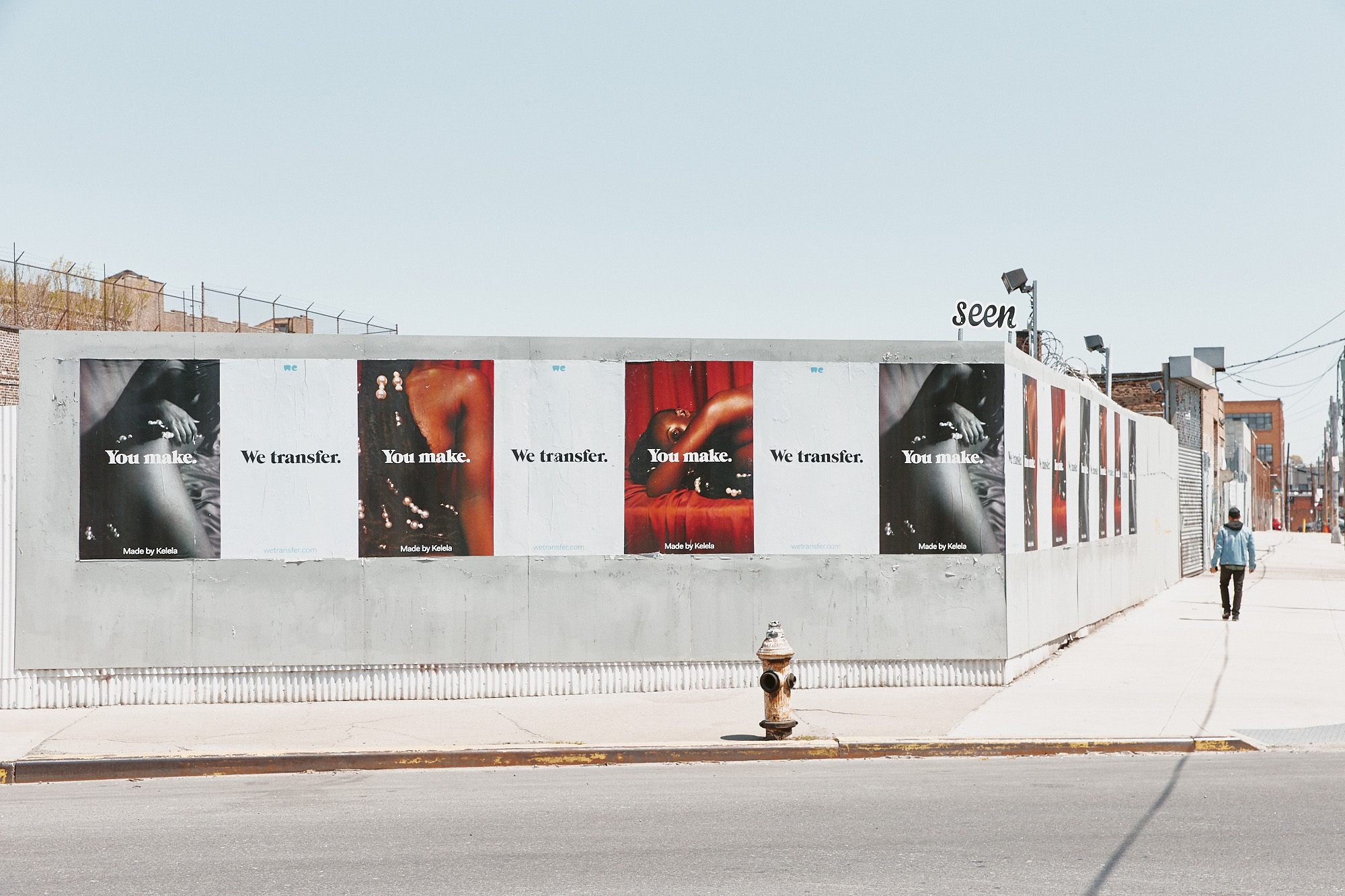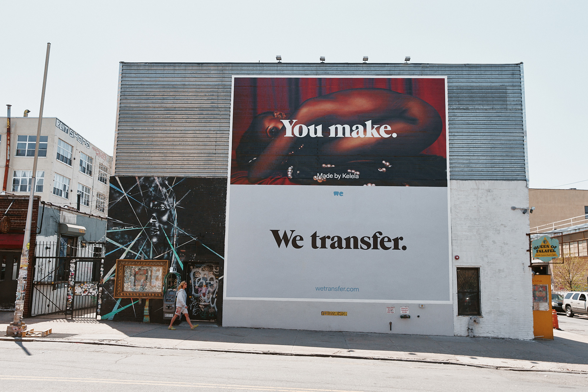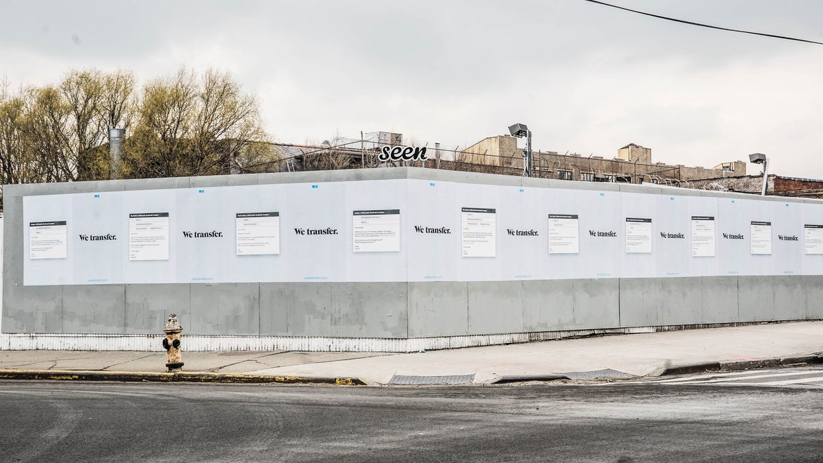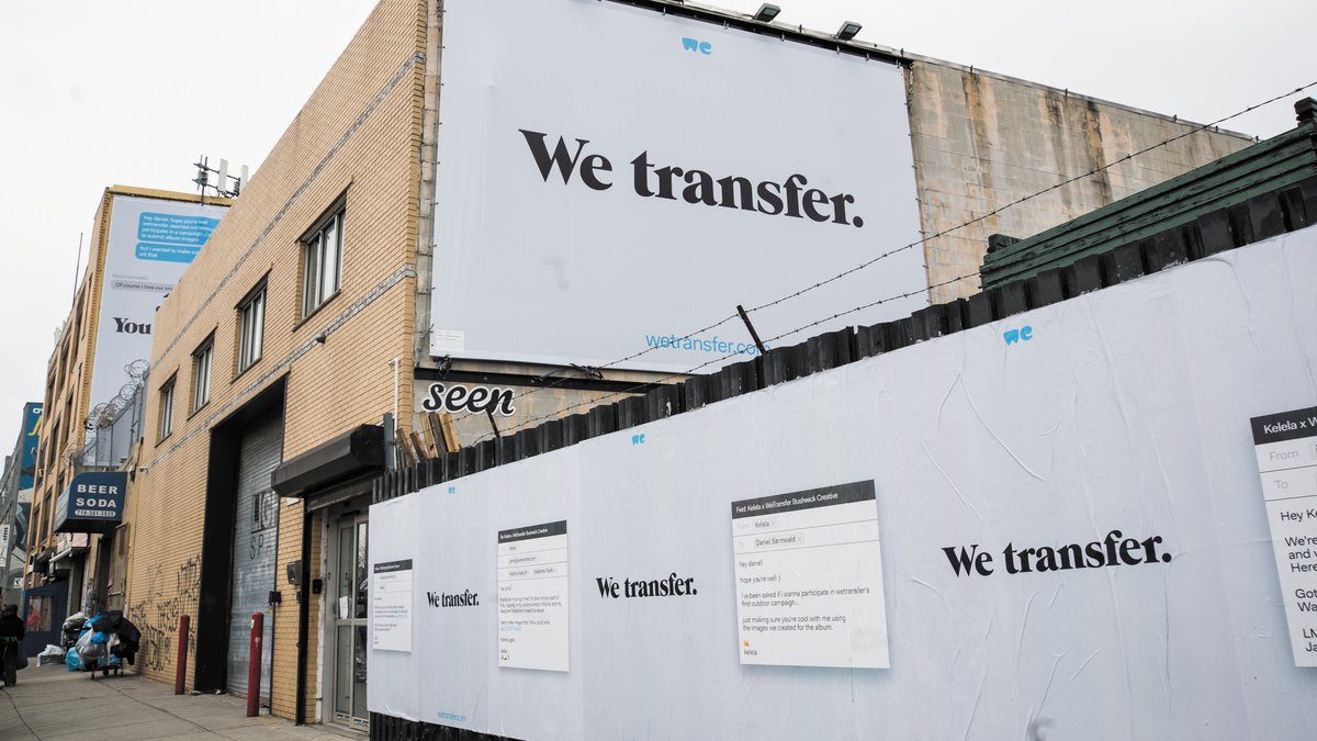 Out of home кампания WeTransfer проходила в апреле 2018 года в пяти локациях в Бруклине. Идея принадлежит креативному агентству Stink Studios. Медиапланирование осуществило агентство Noble People. Рекламные места и создание муралов — Colossal Media и и Seen Outdoor Media. Фотогафии Зенита Ричардса.