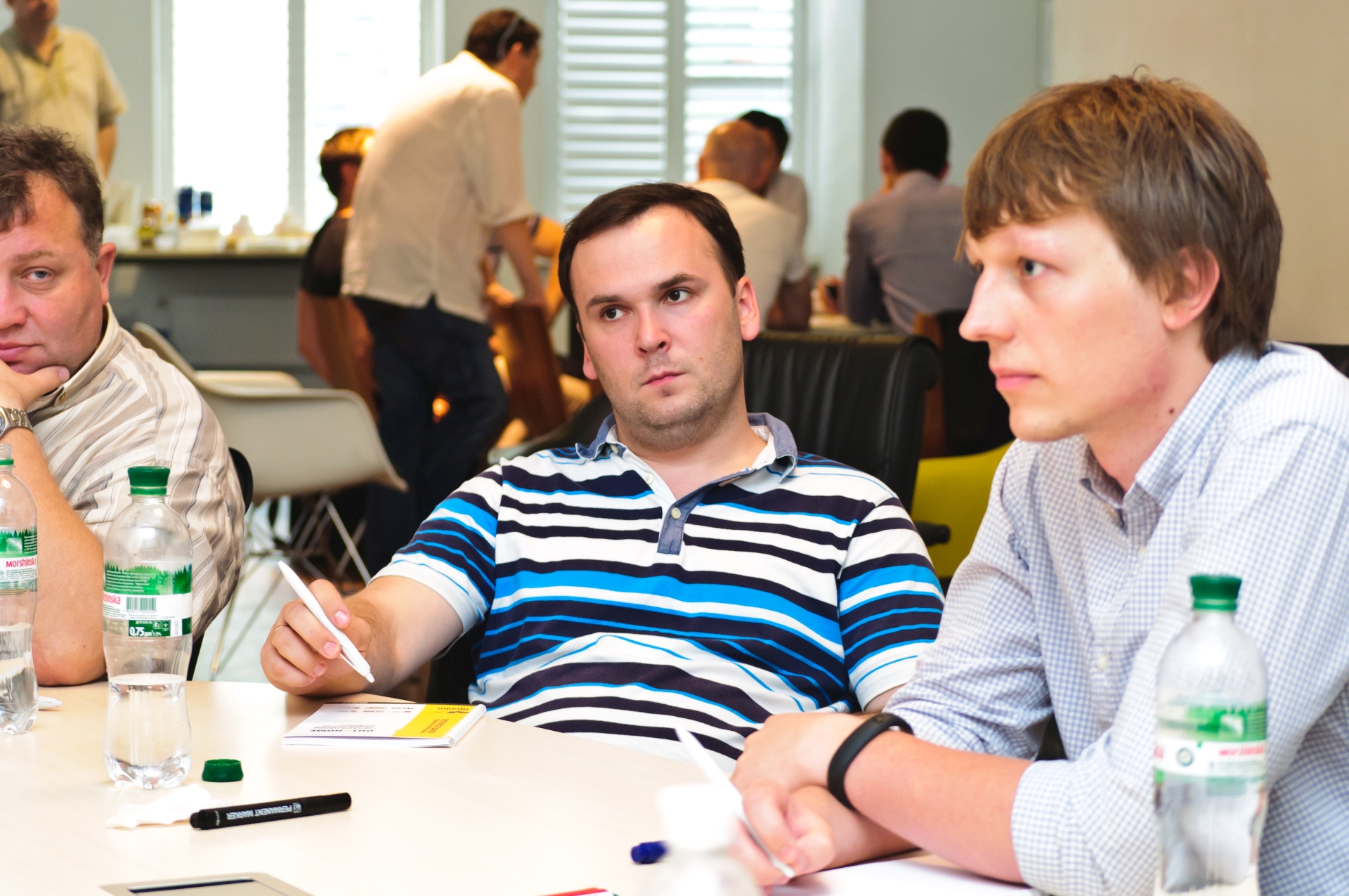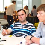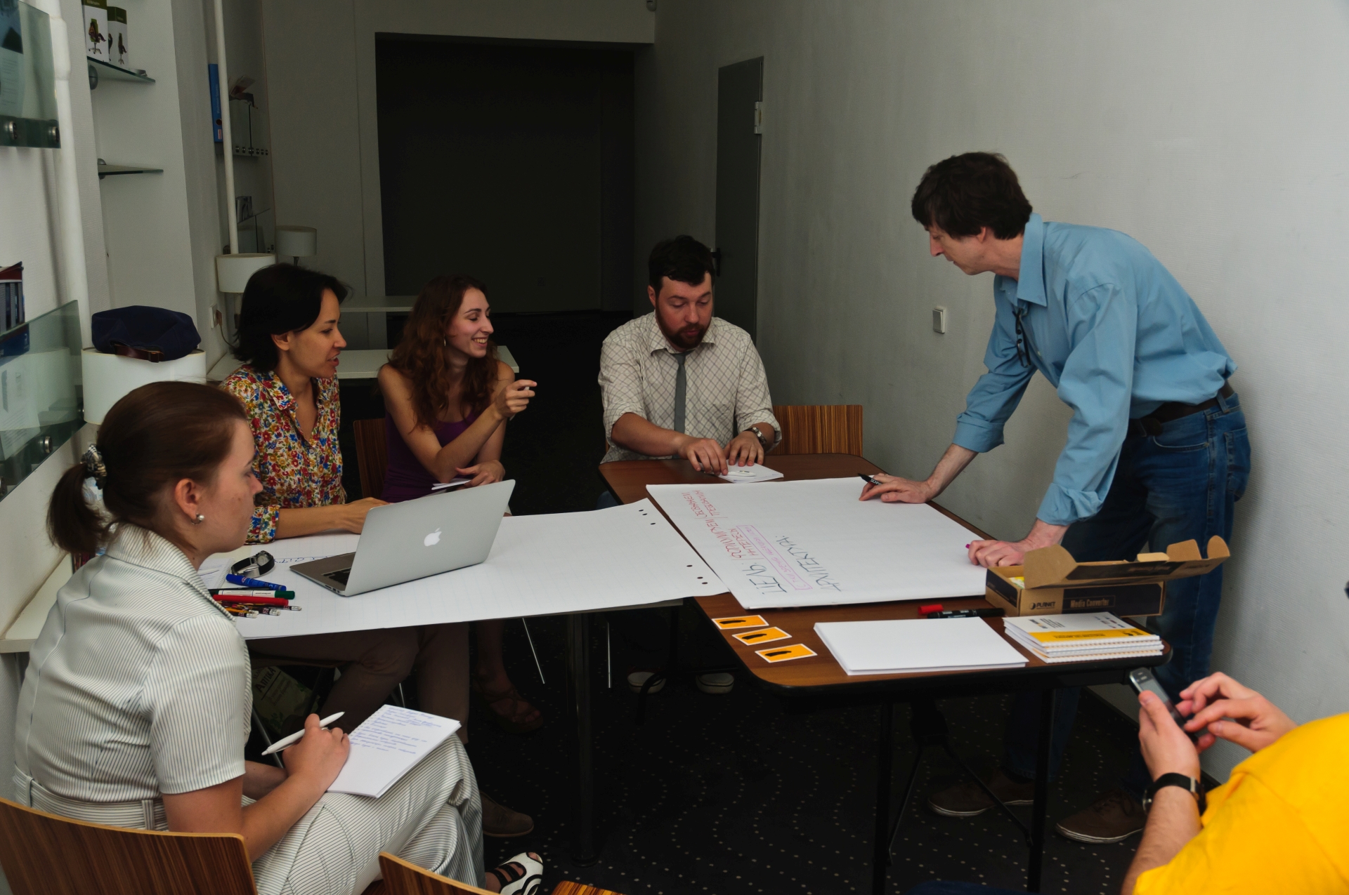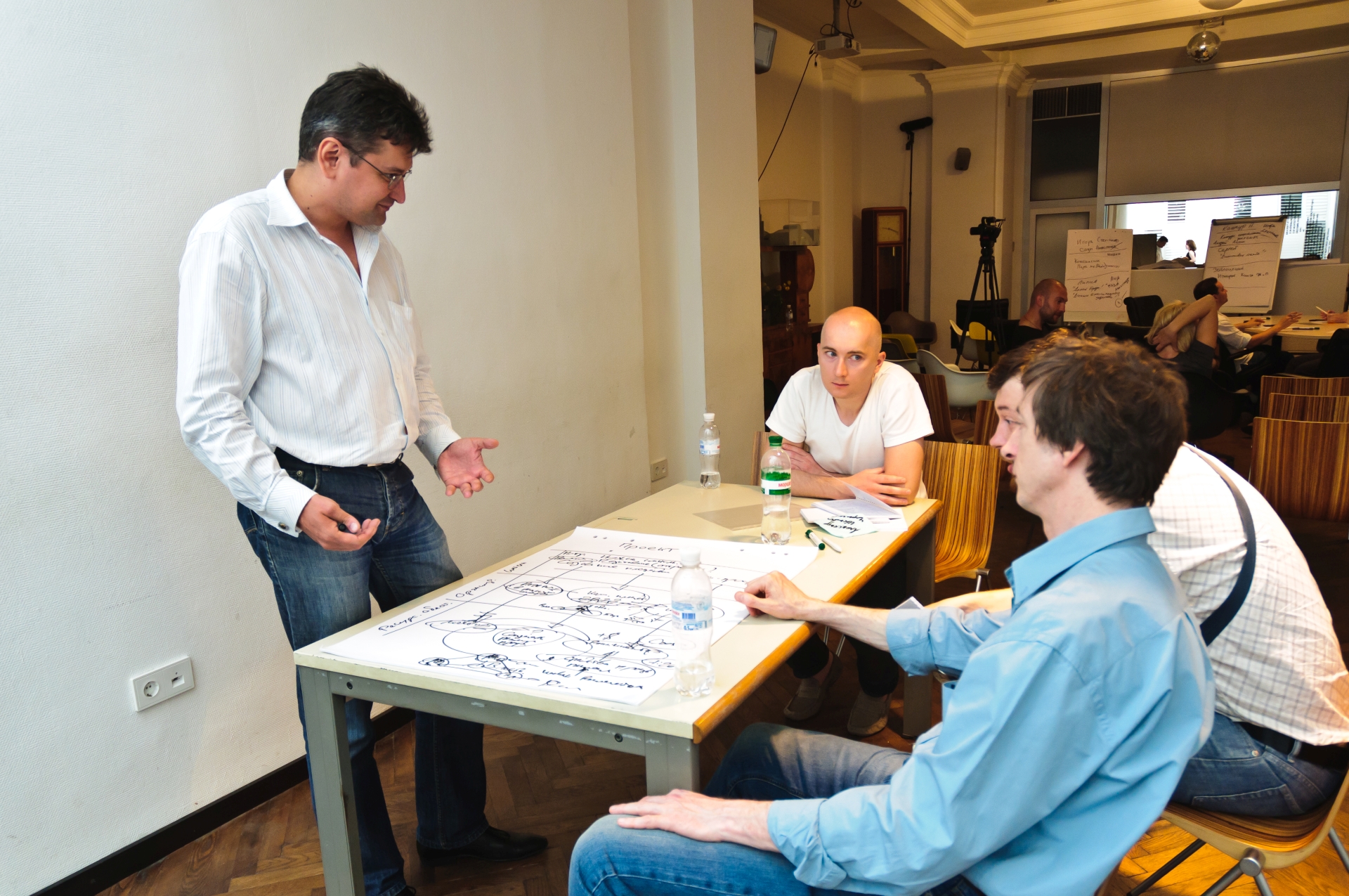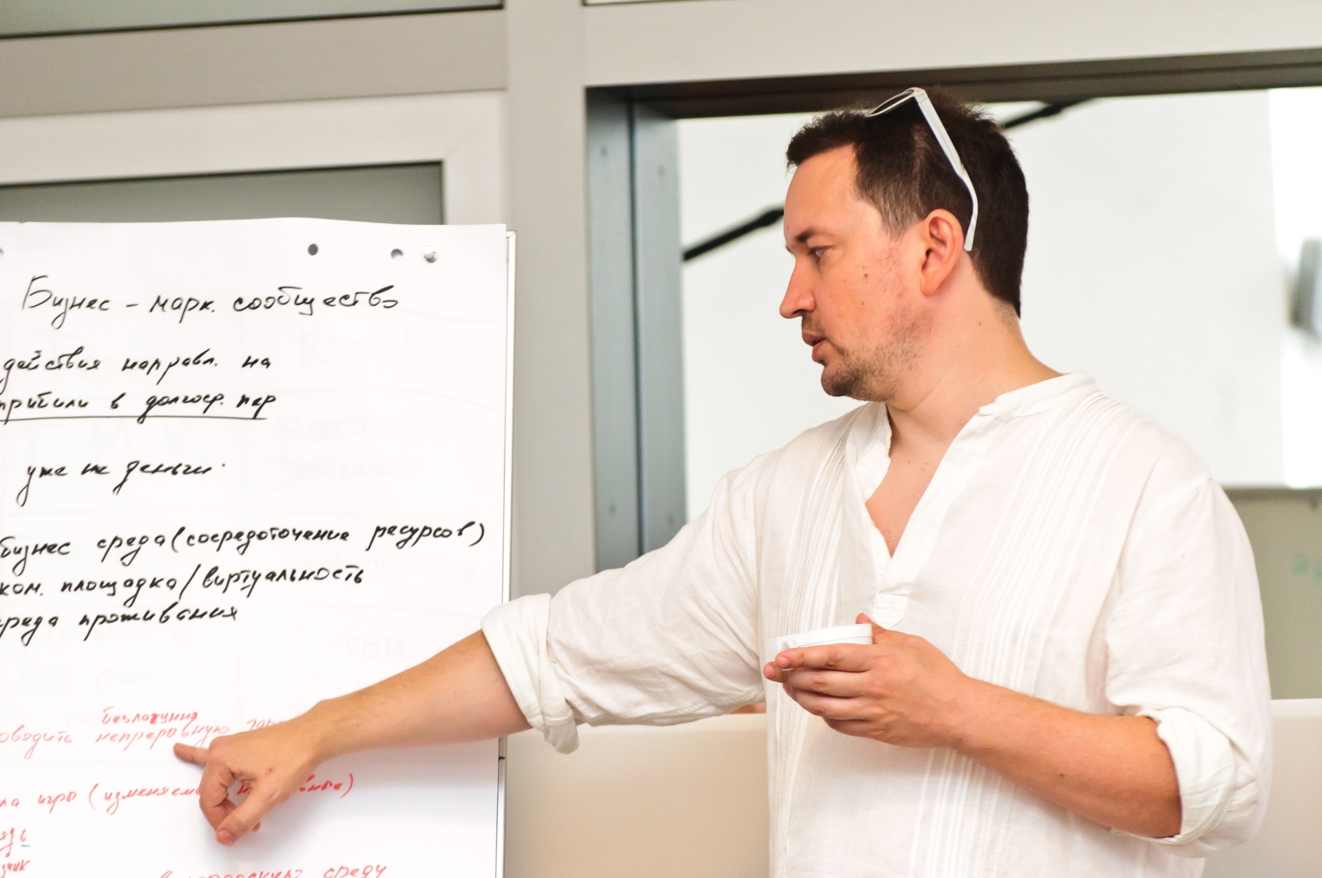 Работа воркшопа проходила в два этапа. На первом этапе из участников были сформированы три команды: «Архитекторы», «Бизнес» и «Общество», которые представили свое видение текущей ситуации в области социальных и маркетинговых коммуникаций в городе, а также предложили возможные пути ее улучшения.